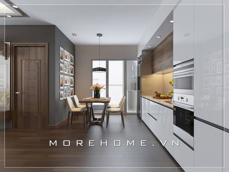 Thiết kế nội thất phòng bếp chung cư hiện đại, kết hợp ánh sáng tự nhiên giúp không gian căn phòng sáng và thoáng mát hơn